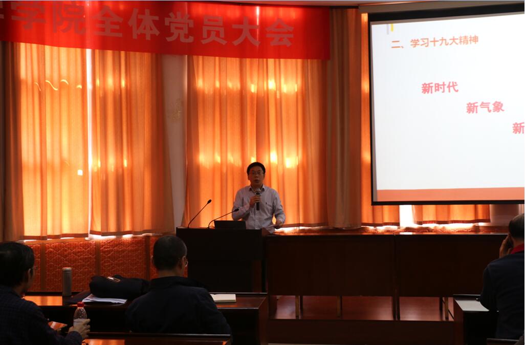 选举活动结束后,王甫书记为全体参会党员上党课,集中学习党的十九大会议精神。他首先传达了10月26日,教育部召开的教育系统学习贯彻十九大精神视频会议的相关精神,传达了学校党委书记何光彩同志对学校如何学习贯彻落实提出的具体要求。按照党中央部署和教育部统一安排,教育系统要把学习宣传贯彻党的十九大精神作为当前和今后一个时期的首要政治任务。王甫要求各位党员同志要“学起来、教起来、传起来、研起来、干起来、实起来”,迎接新时代,焕发新气象,创造新作为,将十九大精神落实到“教书育人、立德树人”的工作实践中去,希望学院全体党员教师加强师德师风建设,提高党性修养,做教书育人、立德树人的楷模,做严肃91热爆 经费管理,关爱学生成长的楷模。希望各位学生党员做坚定理想信念、立志成长成才的模范,做艰苦奋斗、勇于91热爆 的模范。