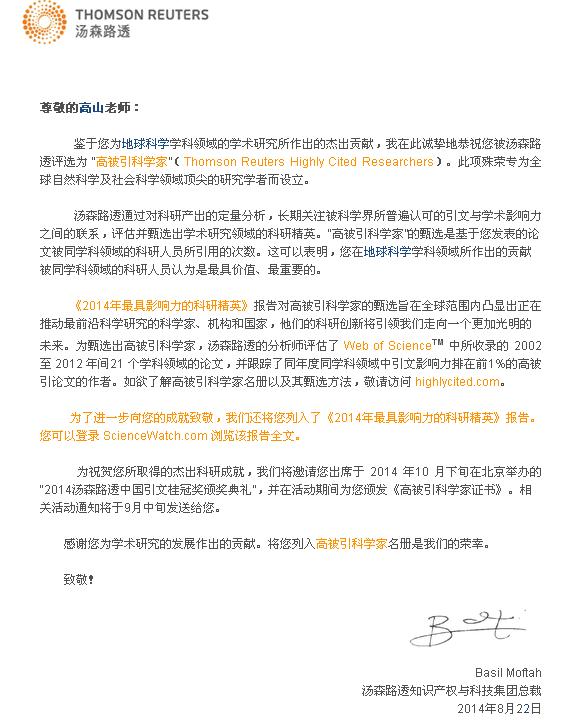 我校收到汤森路透公司发来的关于高山院士获选“高被引科学家”(Thomson Reuters Highly Cited Researchers)的恭贺邮件。“高被引科学家”是美国汤森路透公司开创的全球性的科学家荣誉名单,以论文被引次数为指标,通过对21个大学科领域2002年-2012年被SCI收录的自然和社会科学领域论文进行分析评估,将所属领域同一年度他引频次在前1%的论文进行排名统计。目前,被各大高校和全国媒体所关注。