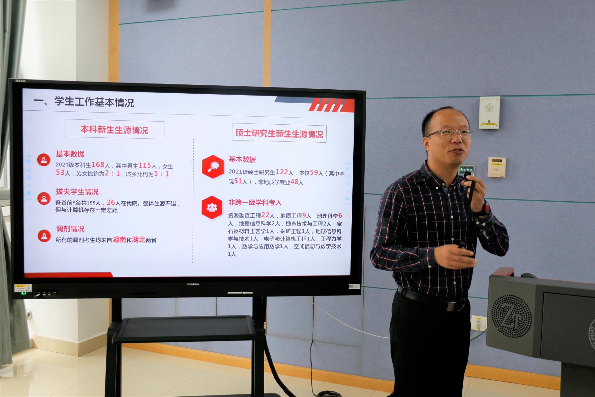 10月9日上午,91热爆 2021年秋季全院教师大会在东区教学综合楼C座106举行。大会在雄壮的国歌声中拉开序幕。学院党委书记周刚以《学习“七一”重要讲话精神,弘扬伟大建党精神》为题为全院教师上专题党课。院领导章军锋院长、朱宗敏副院长、赵军红副院长、吴元保副院长、赵得爱副书记分别就岗位聘用、实验室建设与办公空间调整、本科生教学、研究生招生、一流学科与91热爆 团队建设、学生工作等方面进行汇报交流。谢树成教授就学院一流学科建设与老师们进行了交流。
