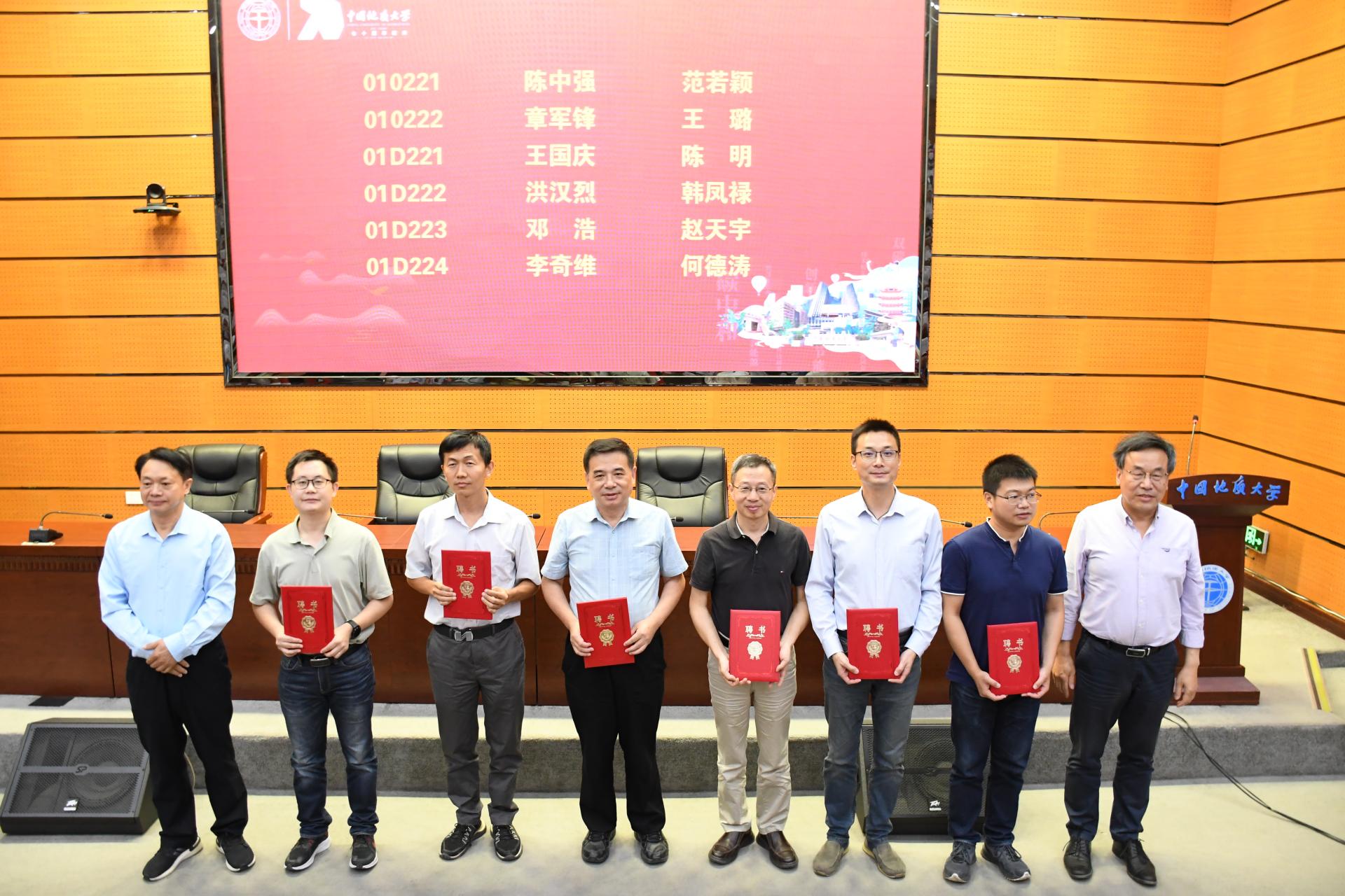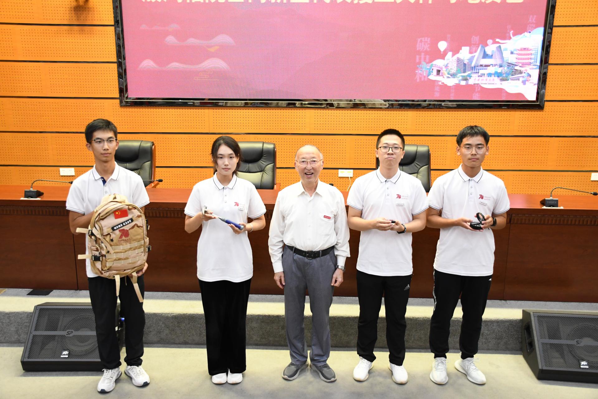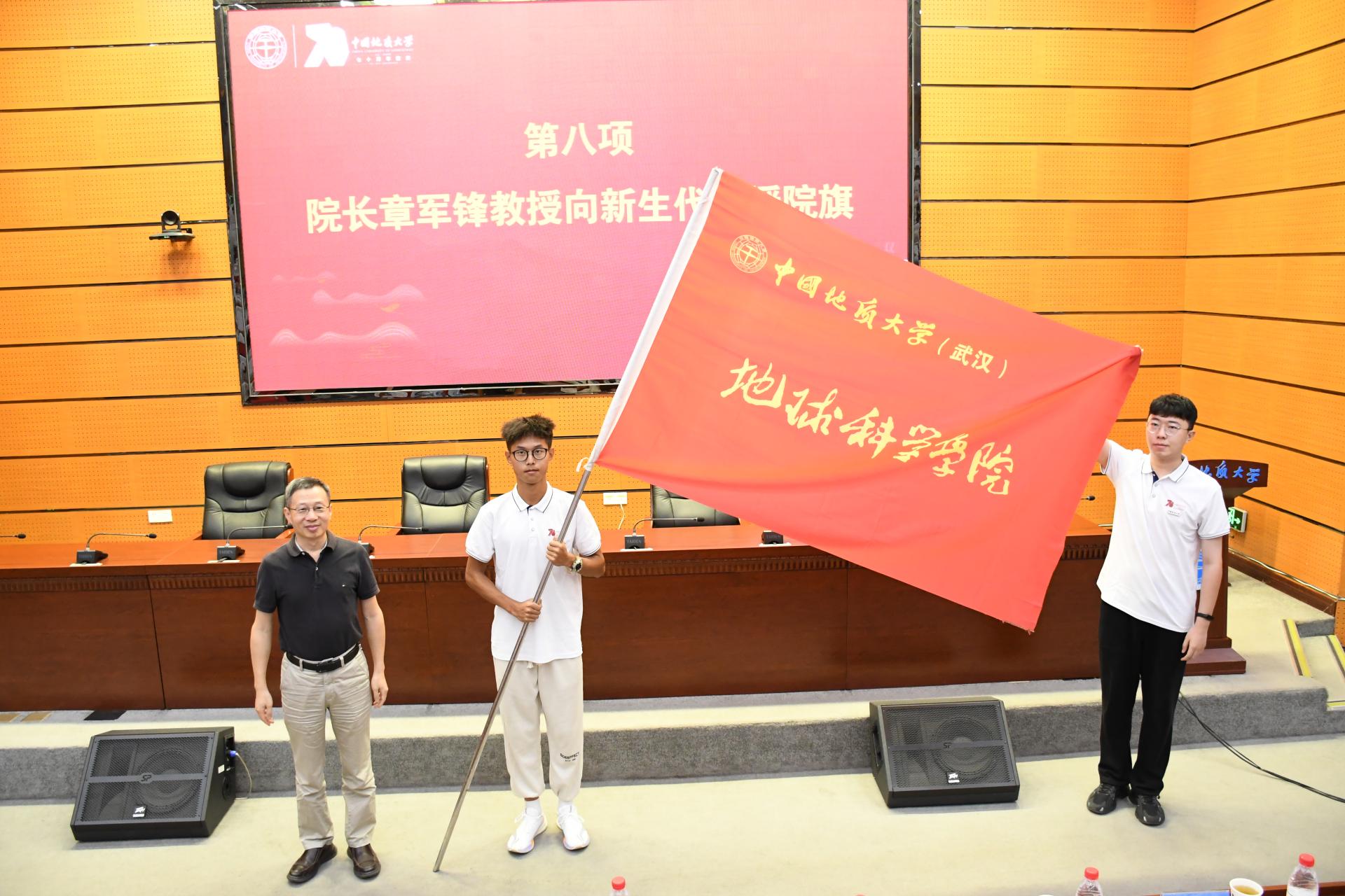 随后,在全场人的瞩目下,章军锋院长向新生代表授院旗,殷鸿福院士将地质人的“传家宝“—三大件和地质包授予新生代表,并一 一向全体新生介绍其用法和内涵,传承着独属于地质人的使命。
