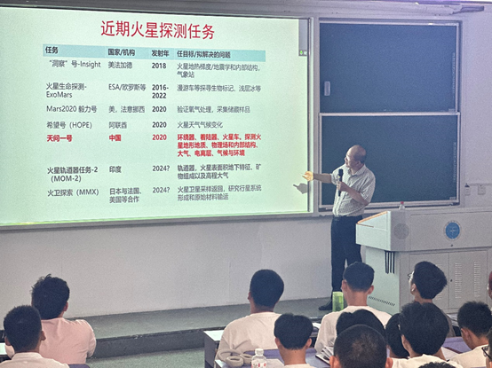 随后,肖龙教授通过几张图片对比了近几十年来我国与世界其它国家在航天领域对月球、火星的星球探测任务,分析我国的优势与存在的差距,并详细介绍了我国探月工程的壮举:嫦娥一号实现首次绕月飞行,完成“探月三步走”的第一步,获取了我国首幅、目前世界上已公布的最清晰、完整的全月球影像图;嫦娥二号首次直接进入地月转移轨道,为嫦娥三号详勘了落月区域;嫦娥三号搭载的玉兔号月球车踏出“中国脚印”,完成落月任务;嫦娥四号成功登陆月球背面,实现全人类首次月球背面软着陆探测;嫦娥五号实现中国首次月球无人采样返回,助力月球成因与演化历史等科学研究。肖龙教授还提到,未来还会有嫦娥六号、七号、八号,也会对火星探测展开更多研究,令现场的同学们心情十分激动。