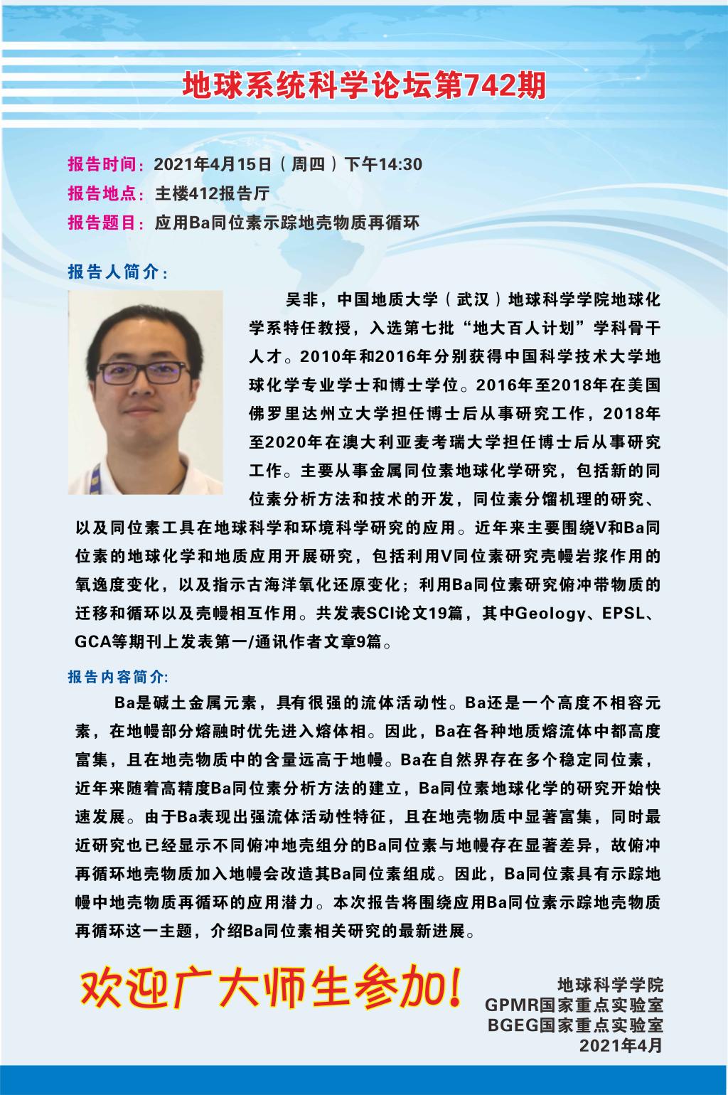 【4月15日】吴非:应用Ba同位素示踪地壳物质再循环