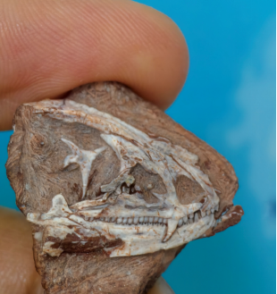 研究团队在江西省赣州市赣县区野外考察时,发现并征集一件保存较完整的蜥蜴化石,标本整体较小,暴露出较为特殊的牙齿,这一特征与其他已报道的蜥蜴化石有所不同。该化石产出层位为塘边组,时代为上白垩统晚期,约8000多万年前。