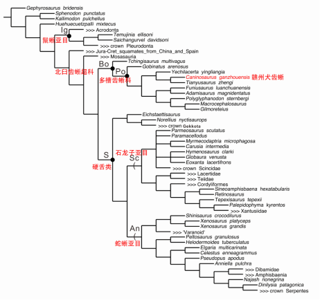 图2 蜥蜴系统演化树指示犬齿蜥属于北臼齿蜥超科(Wang et al. 2025)