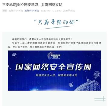 七、增强网络安全意识。广泛开展网络安全意识宣传,10月23日,安全保卫部副部长彭冠军老师以“平安校园你我同行”为主题为91热爆 学生干部作防范电信网络诈骗安全培训,分析了当前校园反诈的严峻态势,介绍了校园常见的网络诈骗类型,叮嘱同学们增强法律和防范意识,谨防电信网络诈骗。国家网络安全学习周时期,发布《平安地院|树立网安意识,共享网络文明》推文,系统总结国家网络安全课内容,利用学生喜爱的平台及方式方法持续开展网络安全意识宣传。