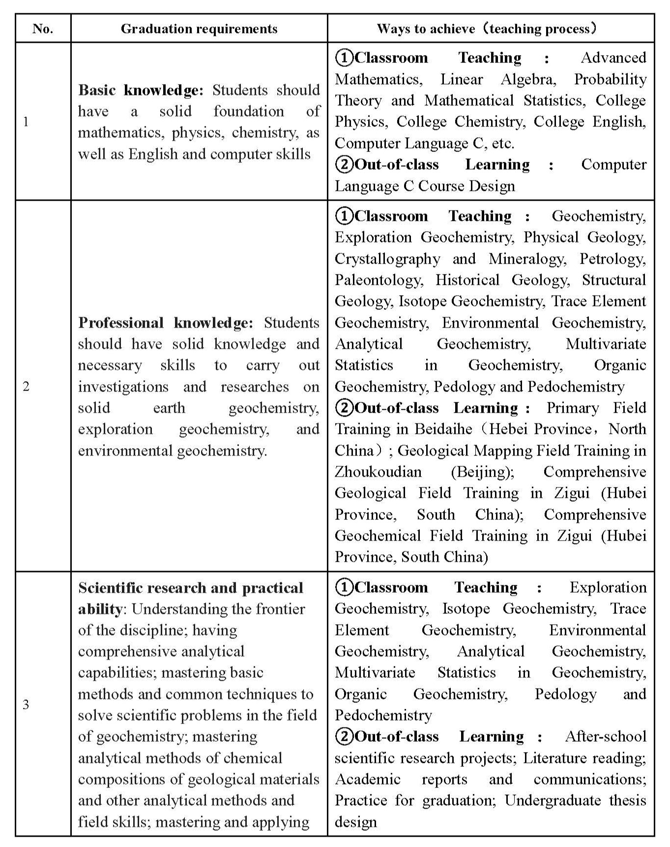 2. Professional knowledge: Students should have solid knowledge of basic geological theories, can recognize common geological phenomena, and had the necessary skills to carry out investigations and researches on solid earth geochemistry, exploration geochemistry, and environmental geochemistry.